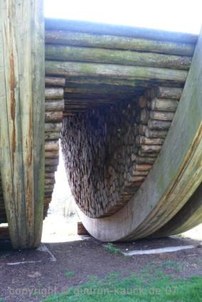 Umweltschäden gezeichnete Baumstämme verarbeitet. Maße: Höhe 10 m, Länge 20 m, Breite 8